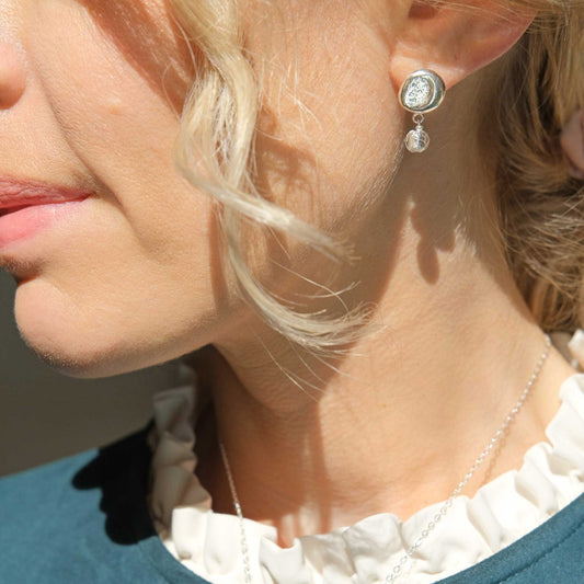 A collection that feels special yet understated — our Molten Moon earrings and necklaces are designed for everyday wear. Crafted from molten sterling silver and finished with a delicate hand-stamped crescent moon and Murano glass charm, the detail is subtle enough to simply catch the light, while still carrying a hint of celestial charm for those who seek it.