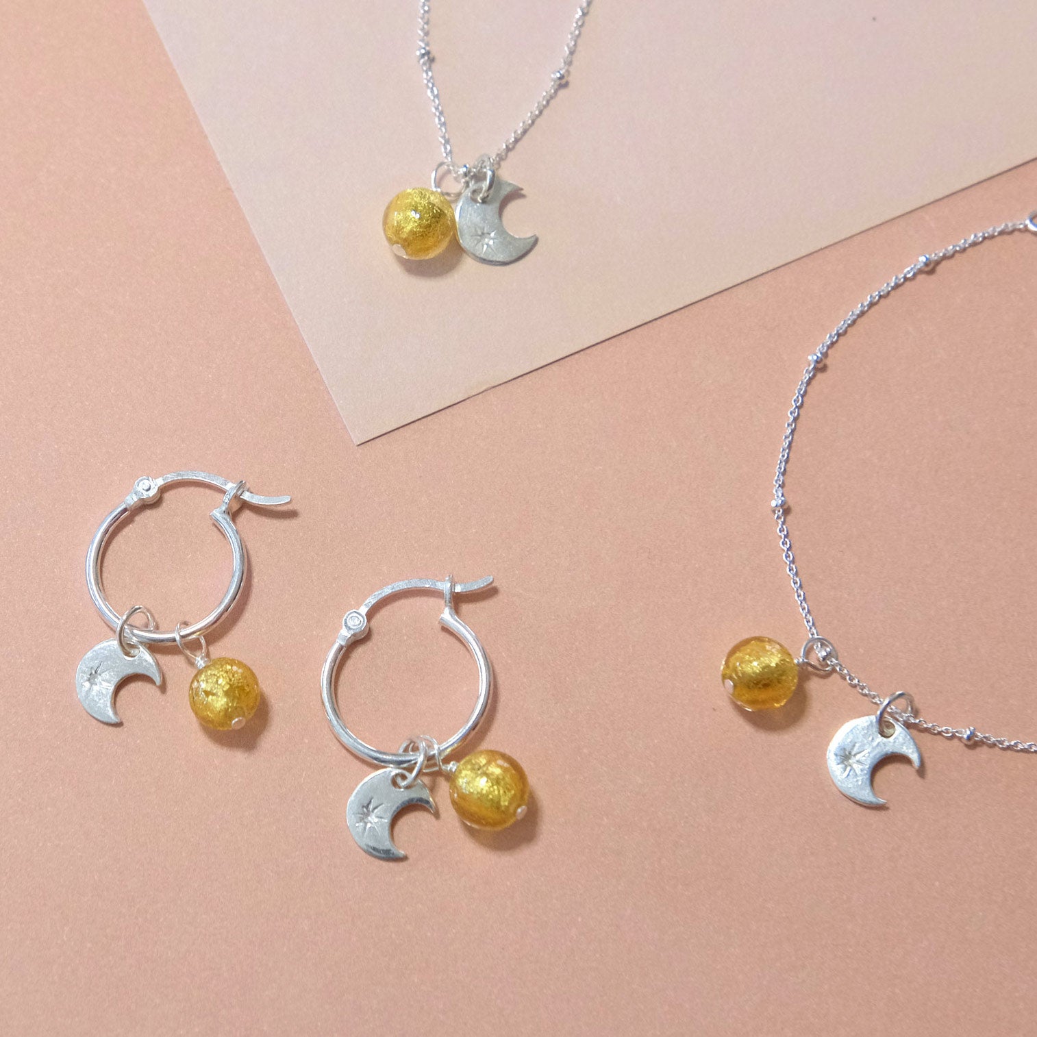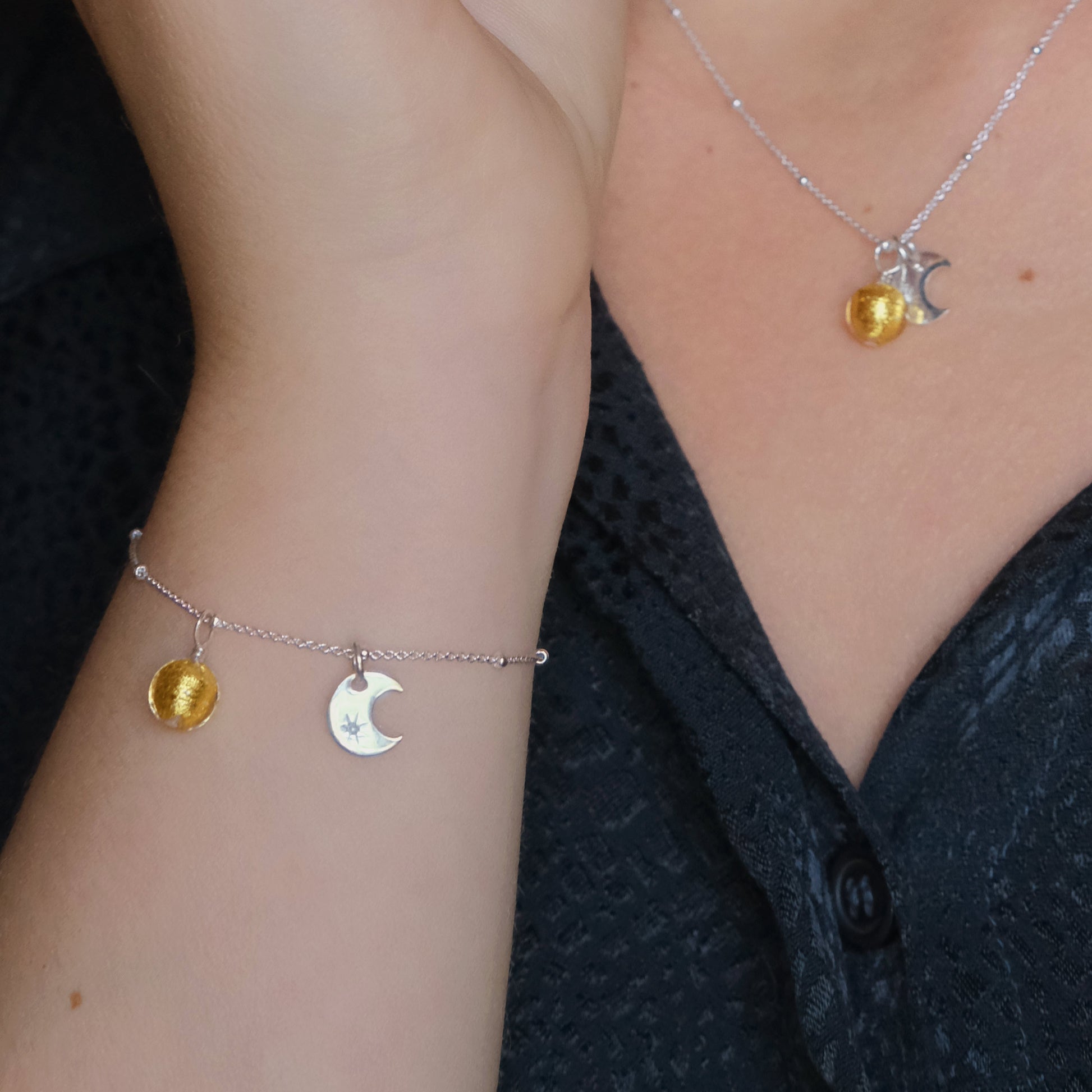 A delicate but eye catching satellite chain features a small moon pendant and a Murano glass gold leaf charm, which represents the sun.