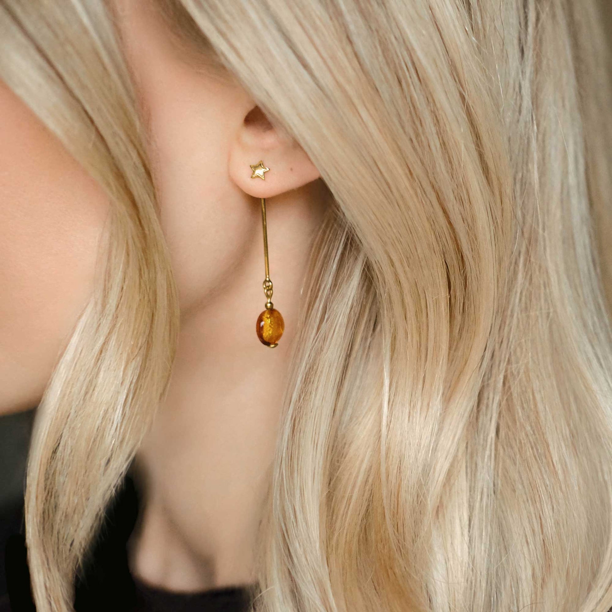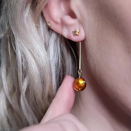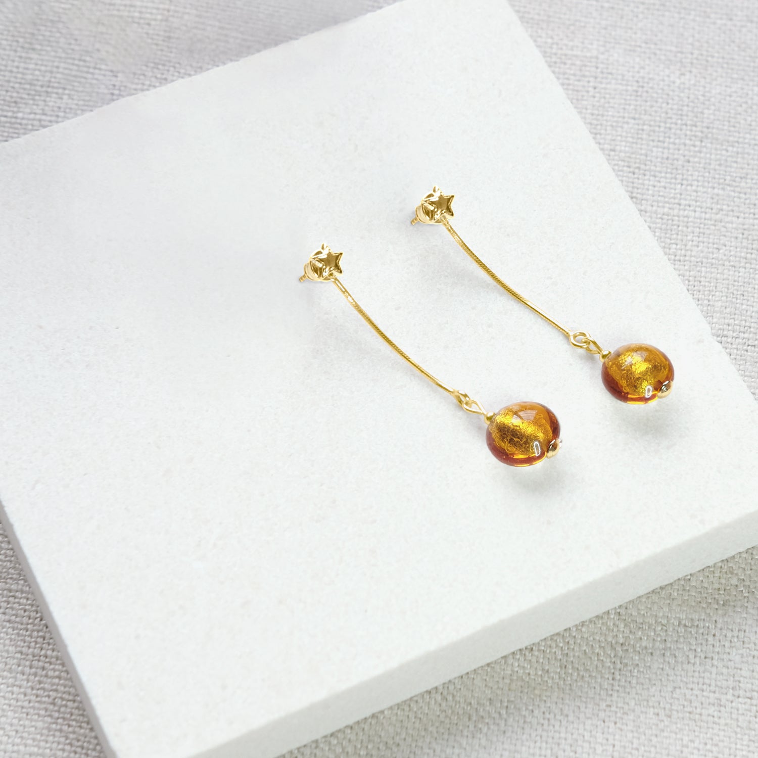 These modern gold drop earrings have a sparkly star stud hovering above a Murano glass dangle. The drop chain and bead are removable, so you can wear the star stud alone and enjoy two looks for the price of one!